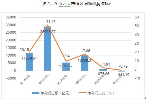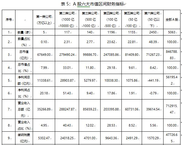 2022年,A股市場頭部效應(yīng)顯著,高市值上市公司經(jīng)營業(yè)績表現(xiàn)極為優(yōu)秀。將A股上市公司按照市值分成六大區(qū)間(見下表),數(shù)據(jù)顯示,千億市值以上的上市公司數(shù)量為122家,占比2.41%,市值規(guī)模達(dá)到34.71萬億元,占比40.99%。從盈利指標(biāo)來看,千億級(jí)上市公司的營業(yè)收入總額達(dá)到32.35萬億元,占比45.38%;凈利潤總額達(dá)到4.02萬億元,占比71.61%。其中,萬億市值以上的上市公司有5家,分別為貴州茅臺(tái)、工商銀行、建設(shè)銀行、中國移動(dòng)、農(nóng)業(yè)銀行,其合計(jì)總市值、營業(yè)收入、凈利潤分別為6.76萬億元,3.53萬億元和1.13萬億元,占A股上市公司相同指標(biāo)總額的比重分別為7.99%、4.95%和20.18%;其平均凈利潤和營業(yè)收入分別達(dá)到2267.72億元和7053.38億元,均遠(yuǎn)超其他類別的上市公司。