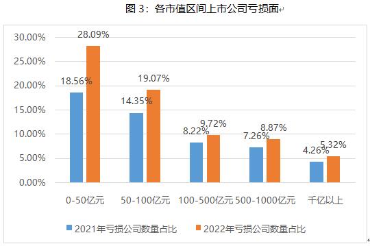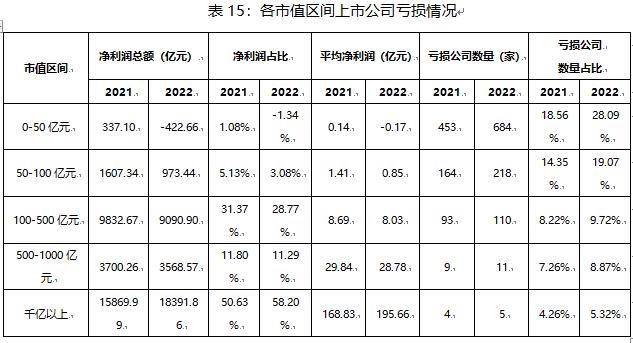 將實(shí)體類上市公司按照市值區(qū)間劃分,虧損公司主要發(fā)生在市值500億元以下的公司類型中,有1012家公司虧損,其中:(1)市值50億元以下的公司,有684家公司虧損,虧損面28.09%,虧損面比上年(18.56%)增加了近10個(gè)百分點(diǎn),這類公司凈利潤總額發(fā)生絕對(duì)虧損,虧損總金額422.66億元;(2)市值50-100億元的公司,有218家公司虧損,虧損面為19.07%,比上年(14.35%)增加近5個(gè)百分點(diǎn);(3)市值100-500億元的公司,有110家公司虧損,虧損面9.72%,比上年(8.22%)增加1.5個(gè)百分點(diǎn);(4)市值500-1000億元的公司,有11家公司虧損,虧損面8.87%,比上年(7.26%)增加1.61個(gè)百分點(diǎn);(5)市值1000億元以上的公司有5家虧損,虧損面5.32%,比上年(4.26%)增加1.06個(gè)百分點(diǎn)。上述可見,隨著市值區(qū)間的提升,虧損上市公司數(shù)量和虧損面都在絕對(duì)下降。