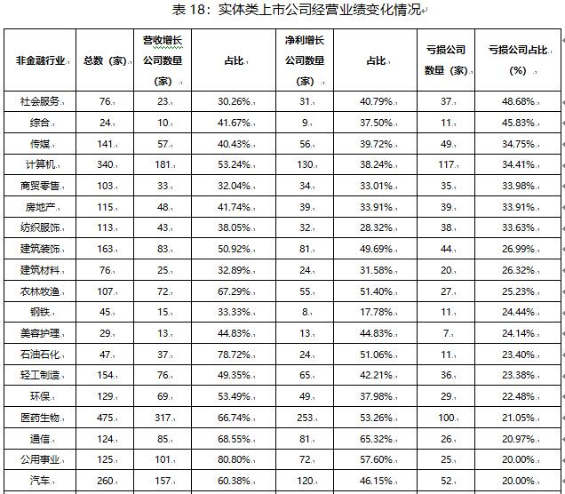 凈利潤出現(xiàn)虧損且虧損面在30%以上的有7大行業(yè),分別是社會(huì)服務(wù)、綜合、傳媒、計(jì)算機(jī)、商貿(mào)零售、房地產(chǎn)和紡織服飾,其虧損面和虧損上市公司家數(shù)分別為48.68%(37家)、45.83%(11家)、34.75%(49家)、34.41%(117家)、33.98%(35家)、33.91(39家)和33.63%(38家)。其中前兩大行業(yè)的占比更是接近50%,此外,計(jì)算機(jī)和醫(yī)藥生物的虧損公司數(shù)量分別達(dá)到117家和100家,行業(yè)經(jīng)營業(yè)績壓力較大。