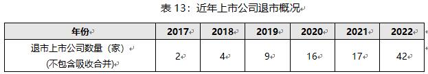 2022年,A股市場共計(jì)退市42家上市公司,創(chuàng)下退市數(shù)量新高,其中,有24家上市公司因被*ST后首個(gè)會(huì)計(jì)年度被會(huì)計(jì)師事務(wù)所出具無法表示意見或者否定意見的審計(jì)報(bào)告而退市,“非標(biāo)退市”已經(jīng)成為推動(dòng)資本市場優(yōu)勝劣汰中非常重要的一環(huán),1家上市公司因連續(xù)20個(gè)交易日的每日股票收盤價(jià)均低于人民幣1元而被退市。板塊情況來看,不同板塊退市公司數(shù)量分別為滬主板18家、深主板16家、創(chuàng)業(yè)板8家。行業(yè)情況來看,退市公司數(shù)量最多的前4個(gè)行業(yè)分別為傳媒(7家)、非銀金融(4家)、醫(yī)藥生物(3家)、社會(huì)服務(wù)(3家)。隨著注冊(cè)制改革的進(jìn)一步深化,可以預(yù)見上市公司退市將逐步常態(tài)化,上市公司只有堅(jiān)守合規(guī)底線,才能保證基業(yè)長青。