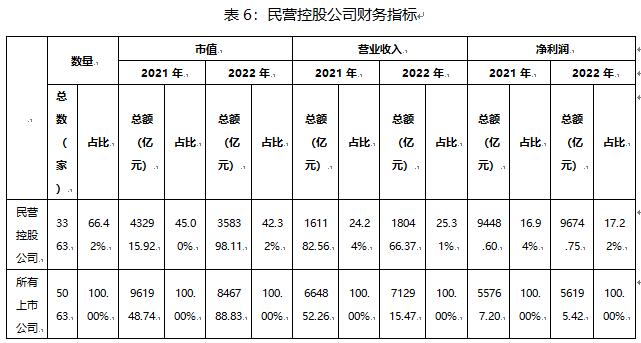 2022年,民營控股公司依舊是資本市場的主力軍,公司數(shù)量達(dá)3363家,占上市公司總數(shù)的66.42%,總市值達(dá)35.84萬億元,占A股總市值的42.32%。此外,民營控股公司的成長活力也獲得持續(xù)激發(fā),營業(yè)收入的占比從24.24%增至25.31%,凈利潤的占比從16.94%增至17.22%,創(chuàng)收創(chuàng)利水平穩(wěn)定上升,為上市公司發(fā)展積聚了內(nèi)在動(dòng)力。2022年,民營控股公司繳納了0.88萬億稅費(fèi),占上市公司繳納稅費(fèi)總額的18.45%。