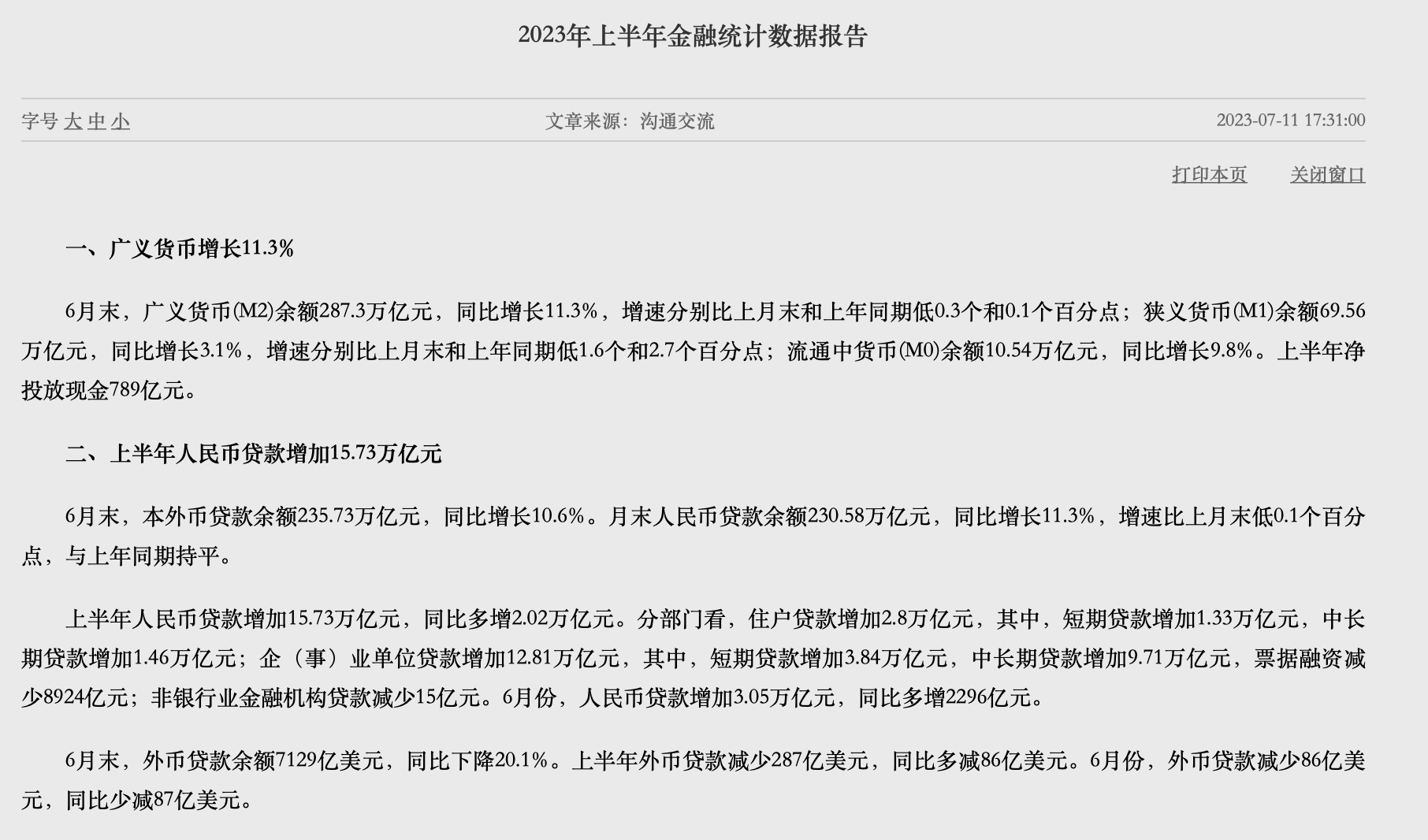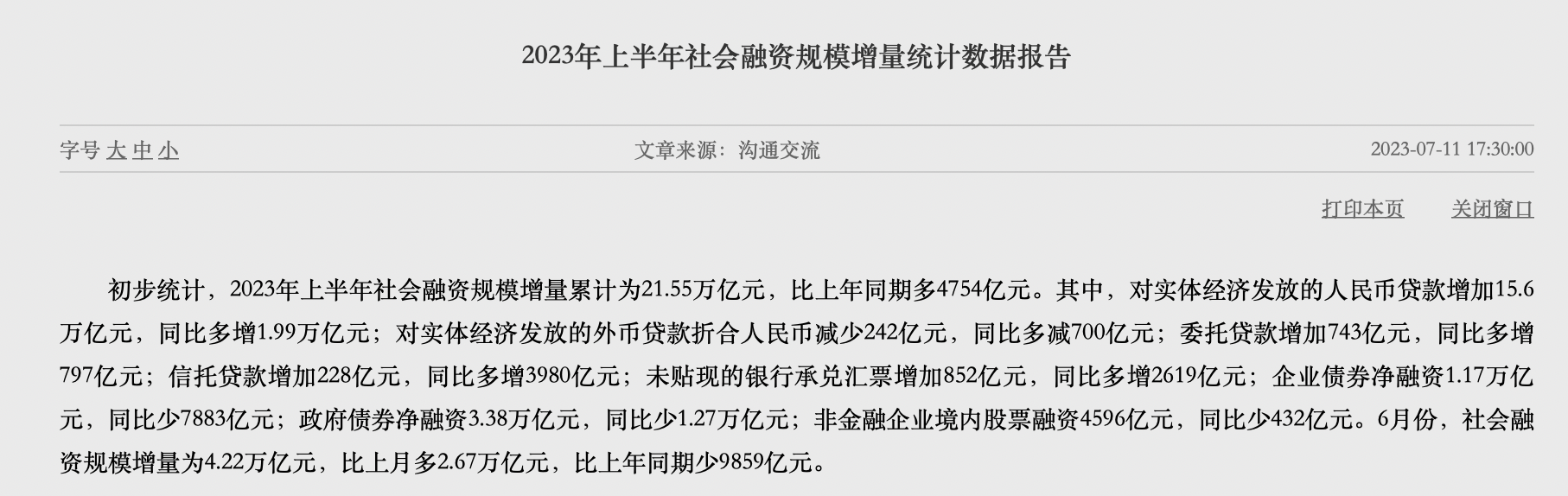 7月11日,中國人民銀行發(fā)布2023年上半年金融統(tǒng)計數(shù)據(jù)報告。數(shù)據(jù)顯示,上半年人民幣貸款增加15.73萬億元,同比多增2.02萬億元。其中,6月份,人民幣貸款增加3.05萬億元,同比多增2296億元。上半年社會融資規(guī)模增量累計為21.55萬億元,比上年同期多4754億元。其中,6月份,社會融資規(guī)模增量為4.22萬億元,比上月多2.67萬億元,比上年同期少9859億元。