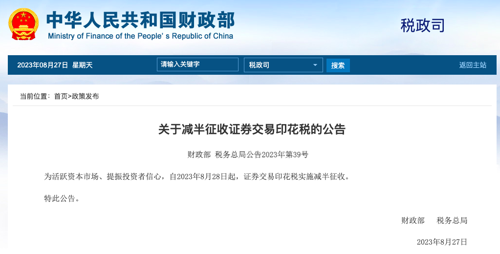 據(jù)財政部網(wǎng)站8月27日消息,為活躍資本市場、提振投資者信心,財政部、稅務(wù)總局發(fā)布《關(guān)于減半征收證券交易印花稅的公告》,自2023年8月28日起,證券交易印花稅實施減半征收。