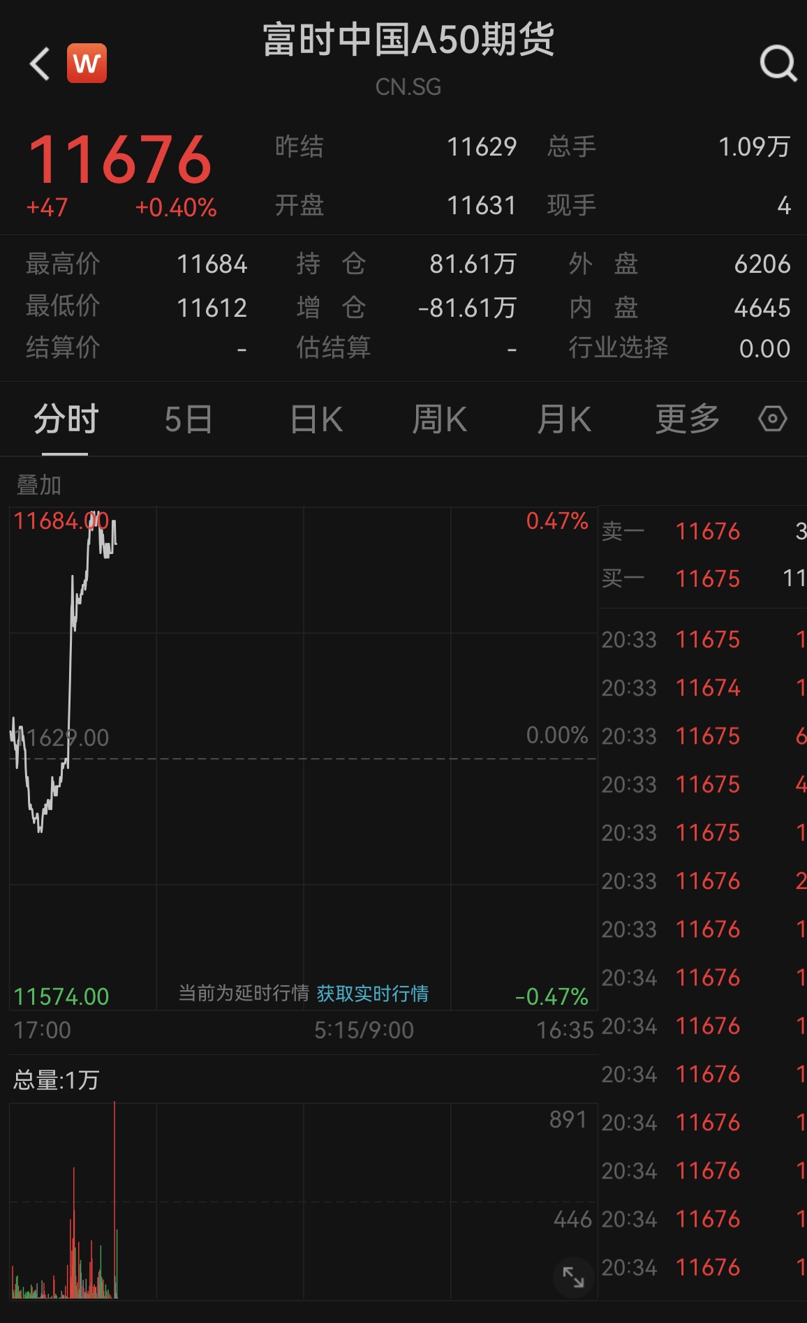 公告發(fā)布后,富時中國A50指數(shù)期貨短線急速拉升,截至記者發(fā)稿,富時中國A50指數(shù)期貨上漲0.40%。