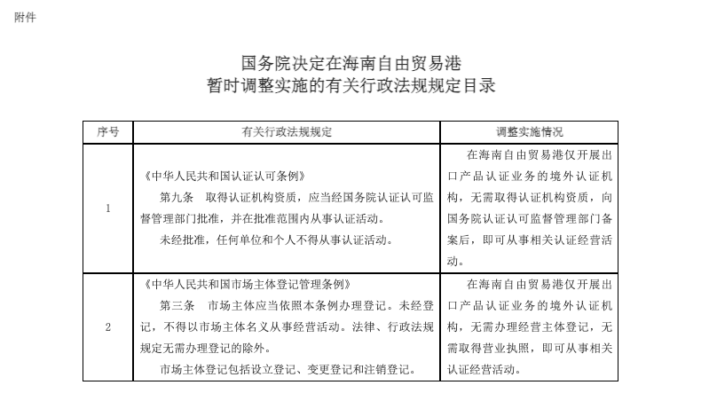 11月2日,中國政府網(wǎng)發(fā)布《國務(wù)院關(guān)于同意在海南自由貿(mào)易港暫時調(diào)整實施有關(guān)行政法規(guī)規(guī)定的批復》。為支持海南自由貿(mào)易港建設(shè),按照《海南自由貿(mào)易港建設(shè)總體方案》,同意自即日起在海南自由貿(mào)易港暫時調(diào)整實施《中華人民共和國認證認可條例》、《中華人民共和國市場主體登記管理條例》有關(guān)規(guī)定(目錄附后),在海南自由貿(mào)易港僅開展出口產(chǎn)品認證業(yè)務(wù)的境外認證機構(gòu),無需取得認證機構(gòu)資質(zhì)和辦理經(jīng)營主體登記,向國務(wù)院認證認可監(jiān)督管理部門備案后,即可開展出口產(chǎn)品認證業(yè)務(wù),認證結(jié)果僅限出口企業(yè)境外使用。備案條件和程序由國務(wù)院認證認可監(jiān)督管理部門制定。