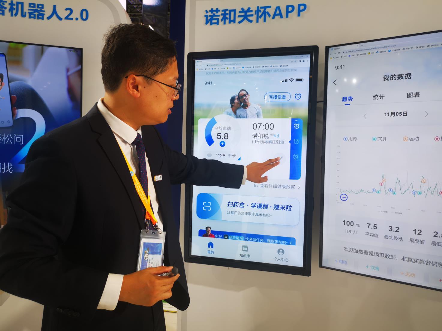 距離美敦力展臺不遠(yuǎn)的諾和諾德展臺上,有四項首展產(chǎn)品正式亮相,包括1款一站式糖尿病自我管理數(shù)字化解決方案——諾和關(guān)懷APP,1款新注射裝置首展,2個創(chuàng)新藥的臨床研究結(jié)果文獻(xiàn)首展?!蹲C券日報》記者發(fā)現(xiàn),許多觀眾都對諾和關(guān)懷APP產(chǎn)生了極大的興趣。