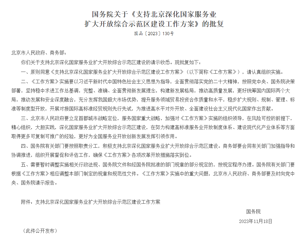 據(jù)中國政府網(wǎng)消息,11月23日,國務(wù)院發(fā)布文件,原則同意《支持北京深化國家服務(wù)業(yè)擴(kuò)大開放綜合示范區(qū)建設(shè)工作方案》(以下簡稱《工作方案》)。