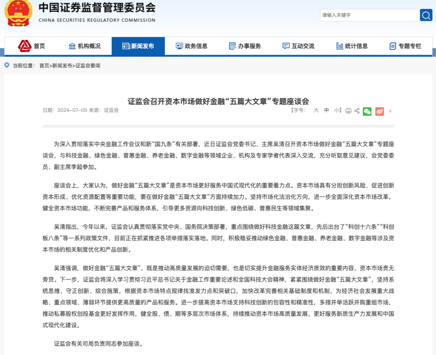 本報訊 (記者毛藝融)為深入貫徹落實中央金融工作會議和新“國九條”有關(guān)部署,近日,證監(jiān)會黨委書記、主席吳清召開資本市場做好金融“五篇大文章”專題座談會,與科技金融、綠色金融、普惠金融、養(yǎng)老金融、數(shù)字金融等領(lǐng)域企業(yè)、機(jī)構(gòu)及專家學(xué)者代表深入交流,充分聽取意見建議,會黨委委員、副主席李超參加。