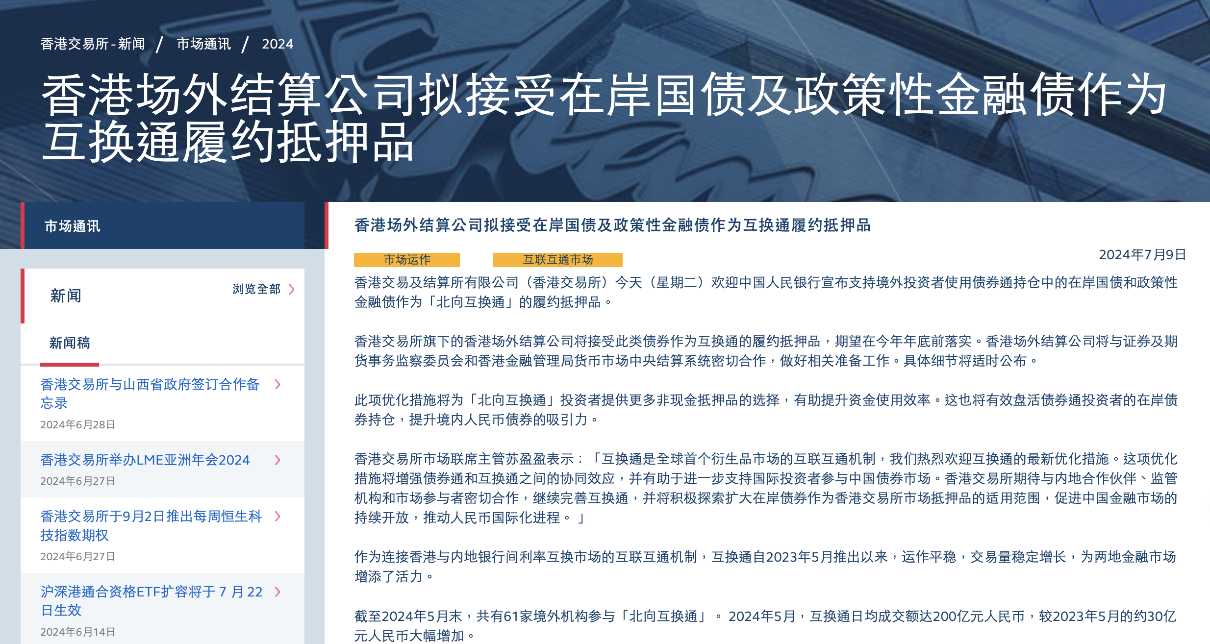 本報(bào)訊 (記者毛藝融)7月9日,香港交易所官網(wǎng)發(fā)布消息稱,歡迎中國(guó)人民銀行宣布支持境外投資者使用債券通持倉(cāng)中的在岸國(guó)債和政策性金融債作為“北向互換通”的履約抵押品。
