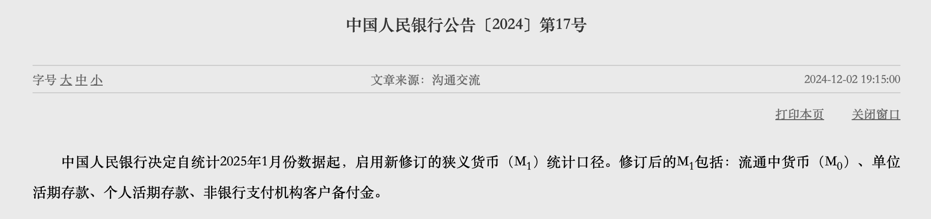 12月2日,中國人民銀行發(fā)布消息稱,中國人民銀行決定自統(tǒng)計2025年1月份數(shù)據(jù)起,啟用新修訂的狹義貨幣(M1)統(tǒng)計口徑。修訂后的M1包括:流通中貨幣(M0)、單位活期存款、個人活期存款、非銀行支付機構客戶備付金。