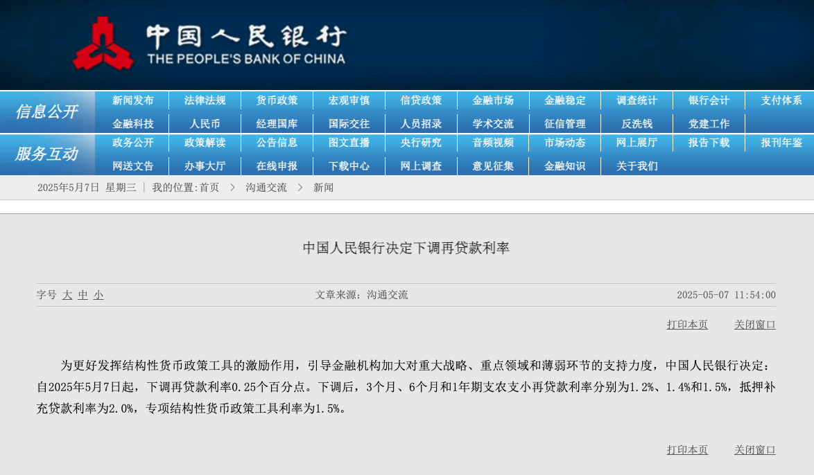 本報訊 (記者韓昱)中國人民銀行5月7日發(fā)布消息稱,為更好發(fā)揮結構性貨幣政策工具的激勵作用,引導金融機構加大對重大戰(zhàn)略、重點領域和薄弱環(huán)節(jié)的支持力度,中國人民銀行決定:自2025年5月7日起,下調再貸款利率0.25個百分點。