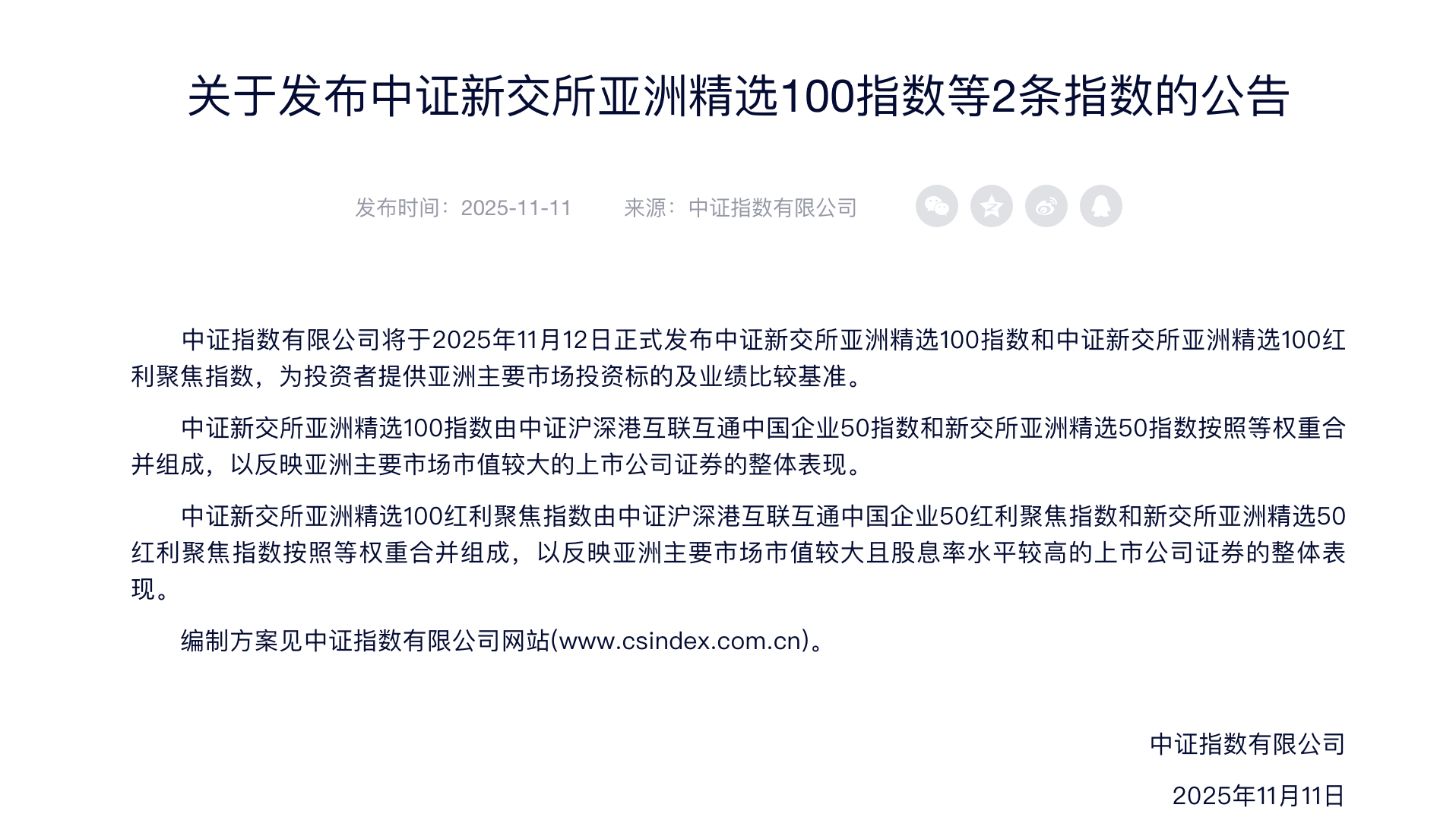 本報訊 (記者毛藝融)11月11日,中證指數(shù)有限公司在官網(wǎng)公告稱,將于2025年11月12日正式發(fā)布中證新交所亞洲精選100指數(shù)和中證新交所亞洲精選100紅利聚焦指數(shù),為投資者提供亞洲主要市場投資標(biāo)的及業(yè)績比較基準(zhǔn)。