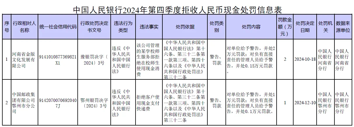 央行對2024年第四季度核實為拒收人民幣現(xiàn)金的2起經(jīng)濟處罰進(jìn)行公示