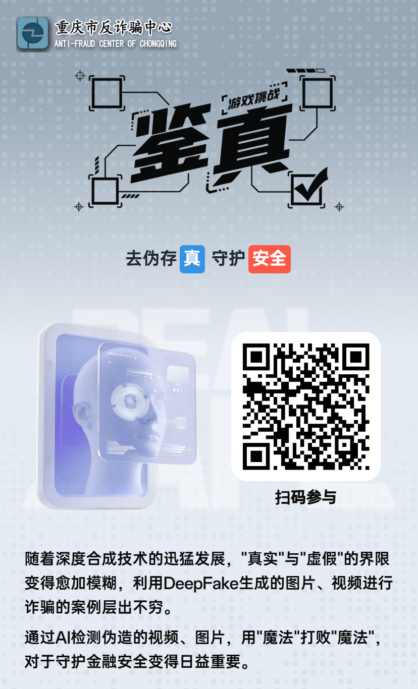 此外,“三件套”還包含針對更廣泛觀眾的AI反詐短劇,真實還原“保本高息”理財騙局,直擊痛點;聚焦前沿科技的“鑒真”防深偽H5小游戲,通過模擬深偽詐騙場景,讓用戶在趣味闖關(guān)中掌握識別AI換臉、擬聲的技巧,實現(xiàn)從“被動聽”到“主動學”的轉(zhuǎn)變。
