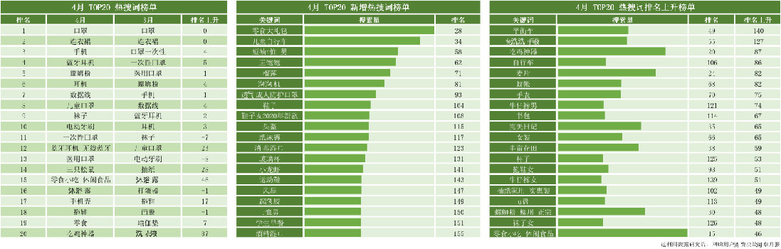 5月7日,返利網(wǎng)數(shù)據(jù)研究院發(fā)布了新一期的《網(wǎng)購用戶消費決策洞察月報》(以下簡稱“月報”)。報告顯示,與3月相較,口罩相關搜索熱度明顯降低,居家消費需求下滑,戶外用品、服飾、3C數(shù)碼相關搜索量激增,夏日經濟初現(xiàn)威力。