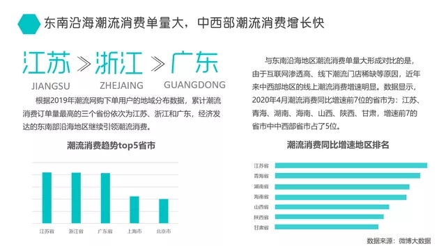 從地域看,經(jīng)濟較為發(fā)達的東南沿海區(qū)域訂單量最高,江蘇、浙江和廣東位列前三。線下潮流門店稀缺的中西部地區(qū)增速明顯。
