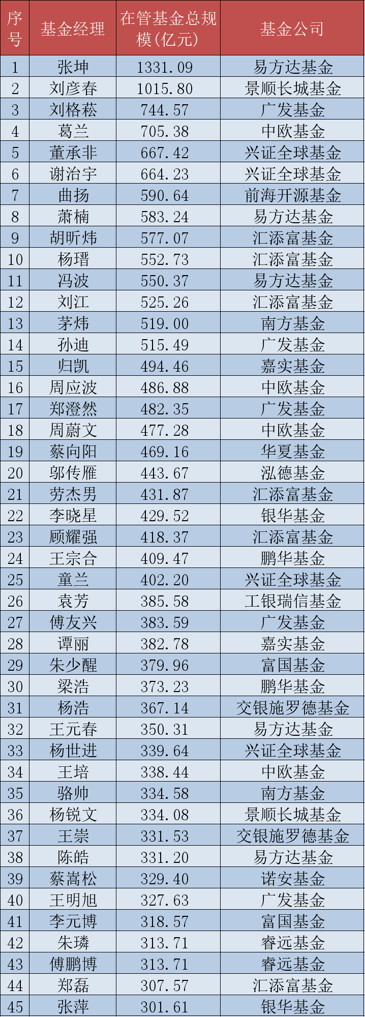 《證券日?qǐng)?bào)》記者根據(jù)東方財(cái)富Choice數(shù)據(jù)和WinD數(shù)據(jù)梳理統(tǒng)計(jì),篩選出一季度在管基金總規(guī)模300億元以上的偏股類(lèi)基金經(jīng)理名單,共計(jì)45名。這些基金經(jīng)理大多是廣為基民熟知的明星基金經(jīng)理。