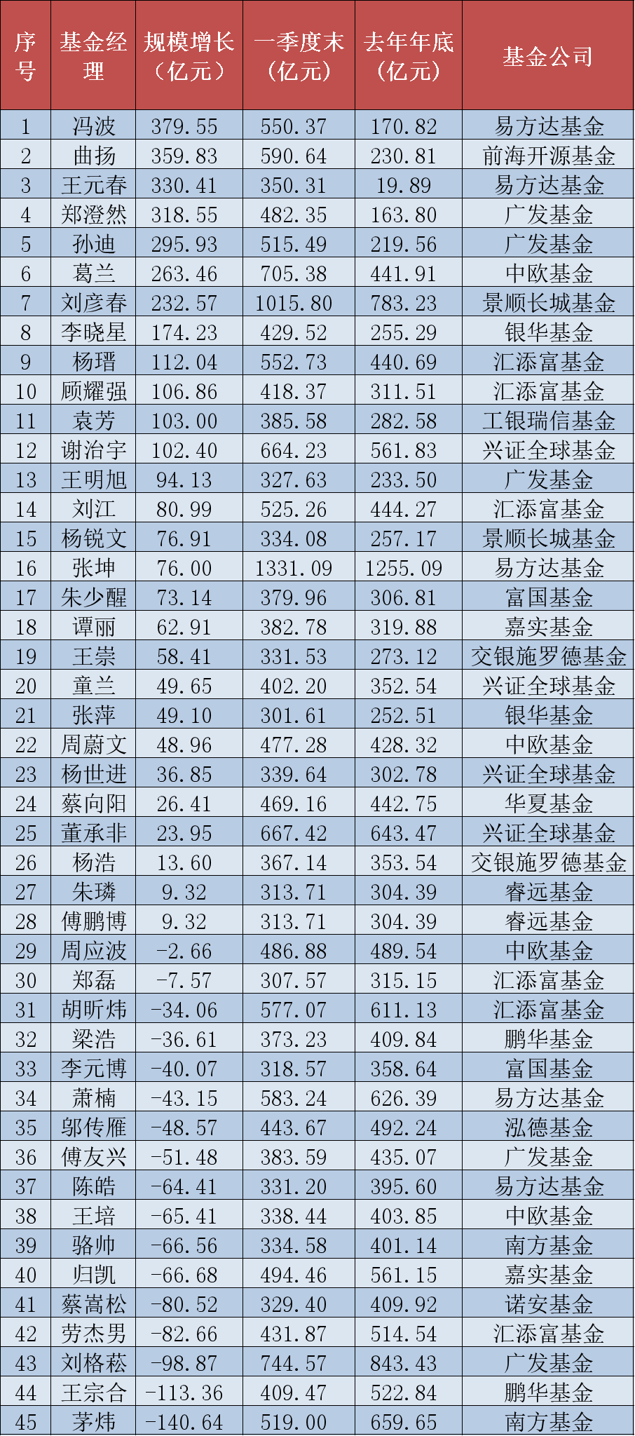 明星基金經(jīng)理一季度管理規(guī)模增幅排行榜: