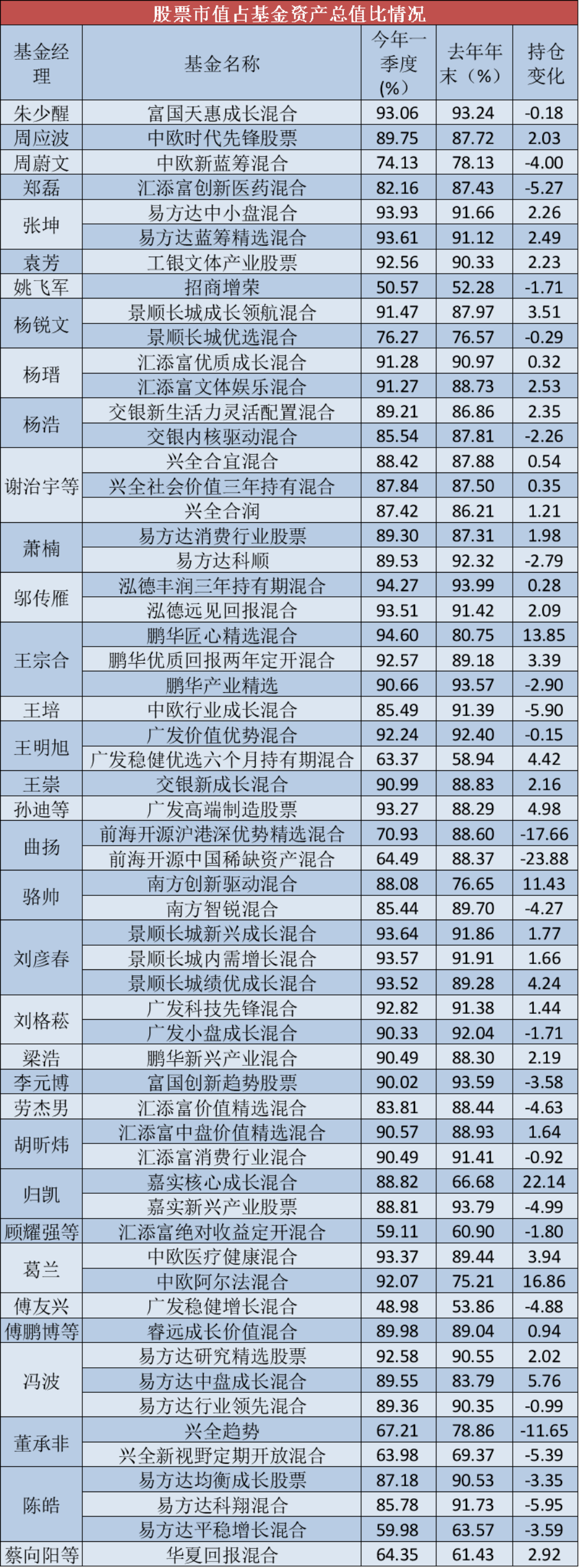 明星基金經(jīng)理一季度部分股票持倉(cāng)變化排行榜:
