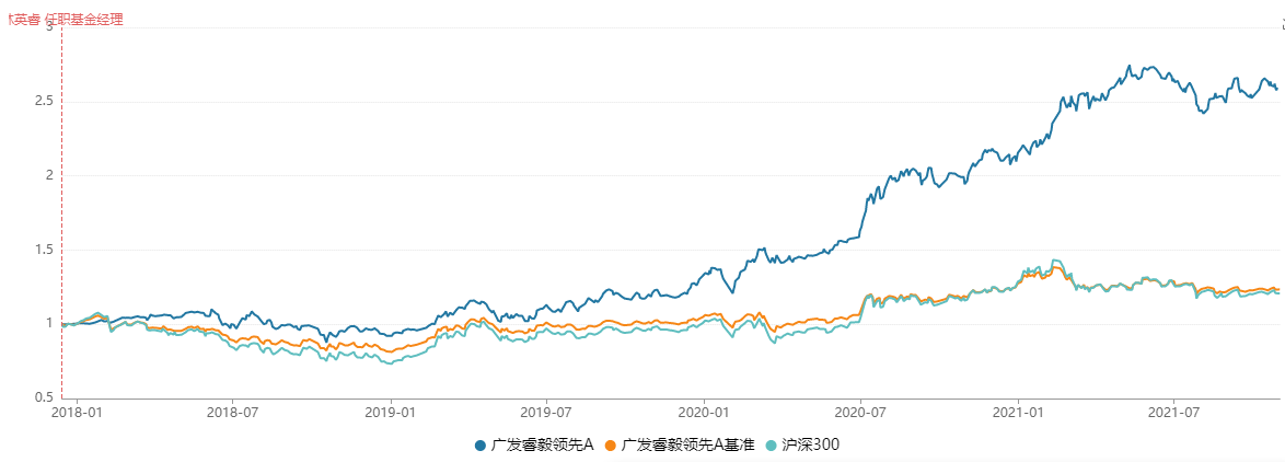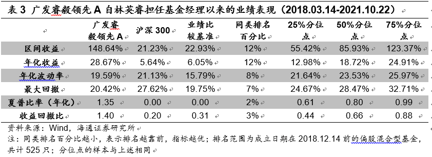 自2017年12月到現(xiàn)在,林英睿管理廣發(fā)睿毅領(lǐng)先的4個(gè)完整年度中,僅2018年出現(xiàn)7.18%的跌幅,其他年份均為正收益?;鹱猿闪⒁詠恚鄢?個(gè)月建倉(cāng)期)的年化夏普比率1.35。