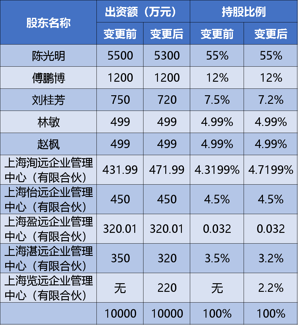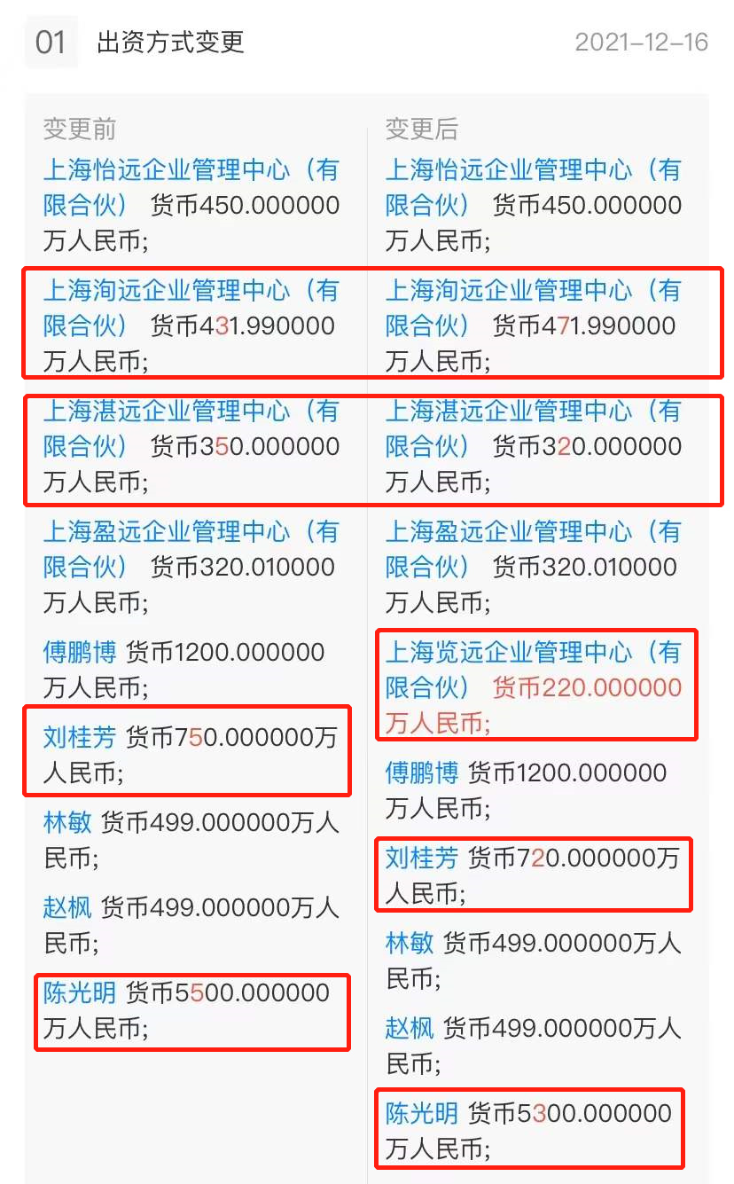 天眼查網(wǎng)站顯示,睿遠(yuǎn)基金在2021年12月16日完成投資人(股權(quán))變更,新增了上海覽遠(yuǎn)企業(yè)管理中心(有限合伙)這一新的員工持股平臺(tái)。與之相對(duì)的是,公司總經(jīng)理陳光明、董事長(zhǎng)劉桂芳在內(nèi)的幾個(gè)股東出資額小幅下滑。