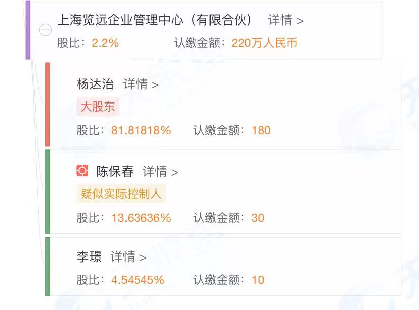 公開資料顯示,新增的上海覽遠(yuǎn)企業(yè)管理中心(有限合伙)成立于2021年12月8日,股東分別為楊達(dá)治、陳保春和李璟。具體來(lái)看,上海覽遠(yuǎn)企業(yè)管理中心(有限合伙)合計(jì)認(rèn)繳220萬(wàn)元,其中,楊達(dá)治、陳保春、李璟三人分別認(rèn)繳180萬(wàn)元、30萬(wàn)元、10萬(wàn)元,合計(jì)持有睿遠(yuǎn)基金2.2%股權(quán),成為睿遠(yuǎn)基金新進(jìn)的第十大股東。