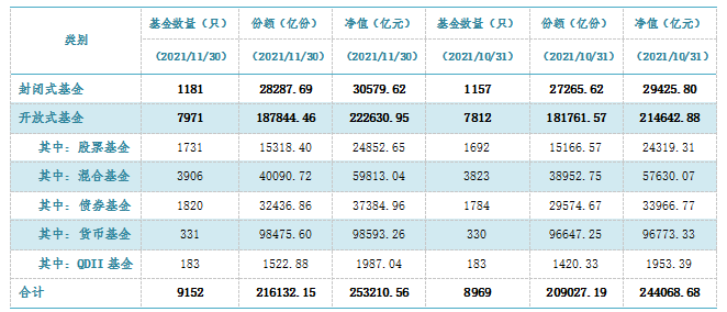 截至2021年11月底,我國(guó)公募基金資產(chǎn)管理規(guī)模合計(jì)為25.32萬億元,較10月底的24.41萬億元增長(zhǎng)3.73%;公募基金數(shù)量合計(jì)9152只,較10月底的8969只增加183只。