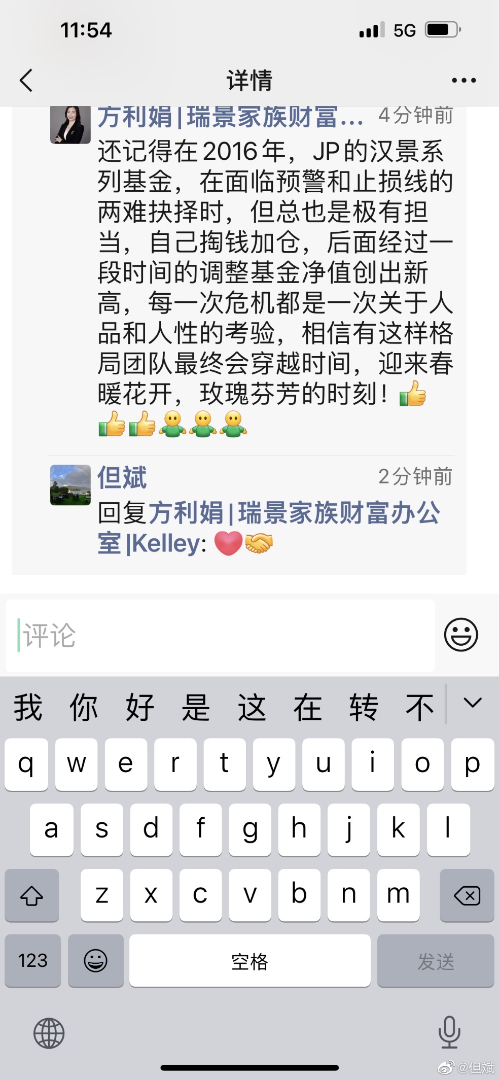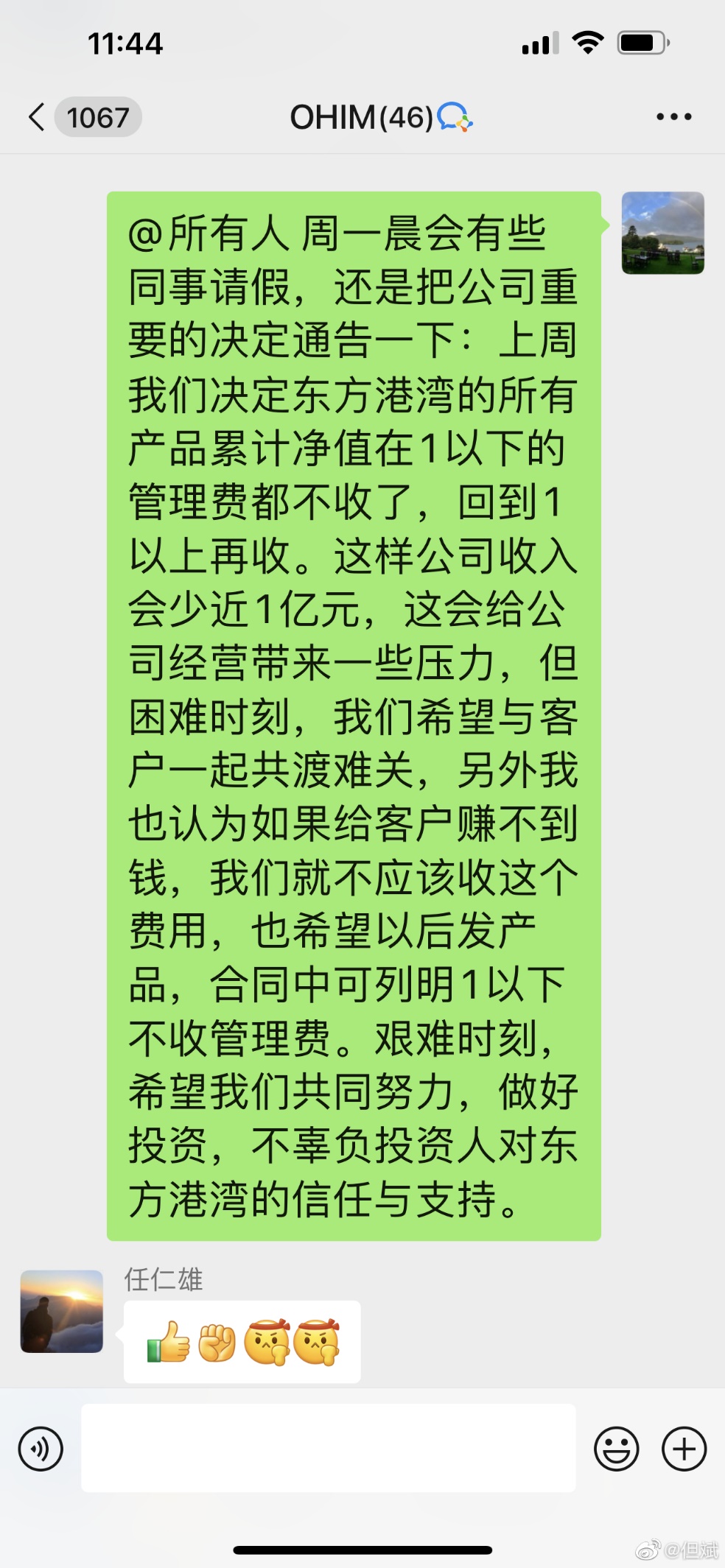 但斌還表示,“另外,我認為如果客戶賺不到錢,我們就不應(yīng)該收這個費用,也希望以后發(fā)產(chǎn)品,合同中可列明1以下不收管理費。目前我們正在與各渠道溝通協(xié)調(diào),艱難時刻,希望我們共同努力,做好投資,不辜負投資人對東方港灣的信任與支持。”