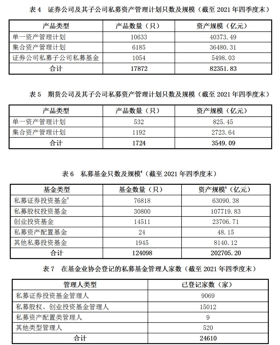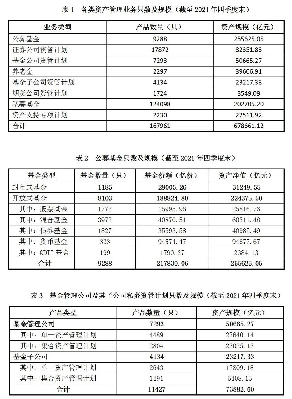 截至2021年四季度末,基金管理公司及其子公司、證券公司、期貨公司、私募基金管理機構(gòu)資產(chǎn)管理業(yè)務(wù)總規(guī)模約67.87萬億元,其中,公募基金規(guī)模25.56萬億元,證券公司及其子公司私募資產(chǎn)管理業(yè)務(wù)規(guī)模8.24萬億元,基金管理公司及其子公司私募資產(chǎn)管理業(yè)務(wù)規(guī)模7.39萬億元,基金公司管理的養(yǎng)老金規(guī)模3.96萬億元,期貨公司及其子公司私募資產(chǎn)管理業(yè)務(wù)規(guī)模約3549億元,私募基金規(guī)模20.27萬億元,資產(chǎn)支持專項計劃規(guī)模2.25萬億元。