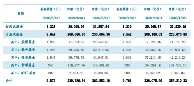 6月29日晚間,中國(guó)基金業(yè)協(xié)會(huì)發(fā)布2022年5月份公募基金市場(chǎng)數(shù)據(jù)。數(shù)據(jù)顯示,截至2022年5月底,公募基金資產(chǎn)凈值合計(jì)26.26萬億元,較4月底的25.52萬億元環(huán)比增長(zhǎng)2.9%。