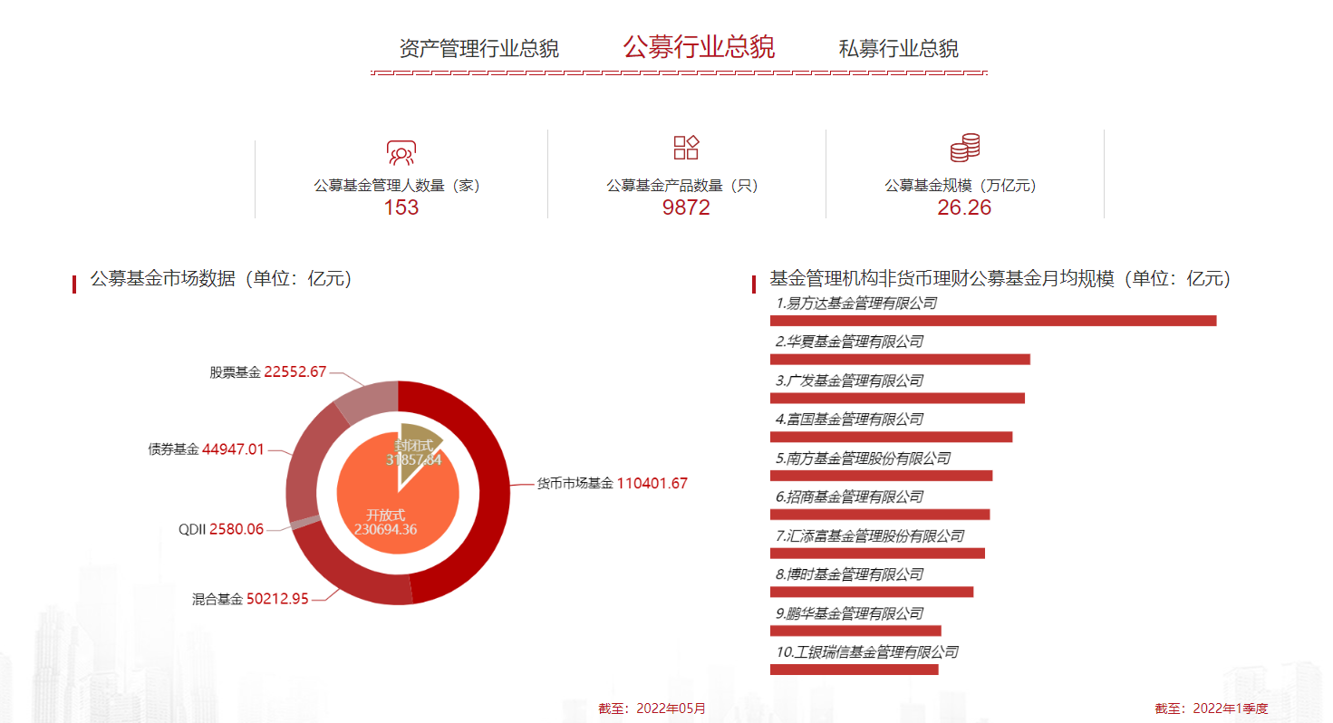 6月29日晚間,中國證券投資基金業(yè)協(xié)會(以下簡稱“中基協(xié)”)公布最新的公募基金市場數(shù)據(jù)顯示,截至2022年5月份,我國境內(nèi)合計153家公募基金管理人管理了9872只公募基金產(chǎn)品,上述產(chǎn)品資產(chǎn)凈值合計26.26萬億元。