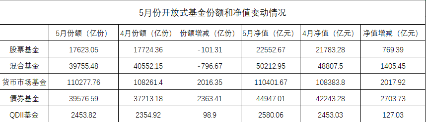 根據(jù)中基協(xié)公布的數(shù)據(jù)顯示,不同類型的基金產(chǎn)品,5月份份額和凈值的漲跌差別也較大。
