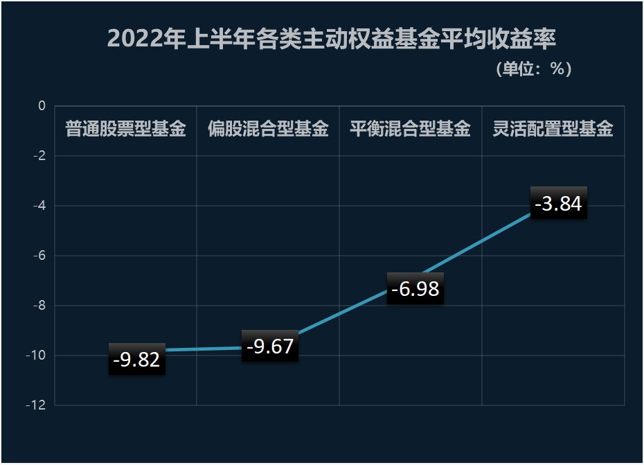 若剔除指數(shù)型基金,主動(dòng)權(quán)益類基金上半年平均收益率回升至-7.25%。其中股票倉(cāng)位在60%以上的偏股混合型基金平均收益率為-9.67%,股票倉(cāng)位在80%以上的普通股票型基金的平均收益率為-9.82%,靈活配置型基金的平均收益率為-6.98%,而平衡混合型基金的平均收益率為-3.84%,整體跑贏大盤(pán)。