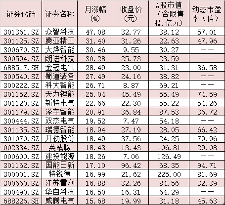 表:月內(nèi)累計(jì)漲幅超15%的儲(chǔ)能概念股