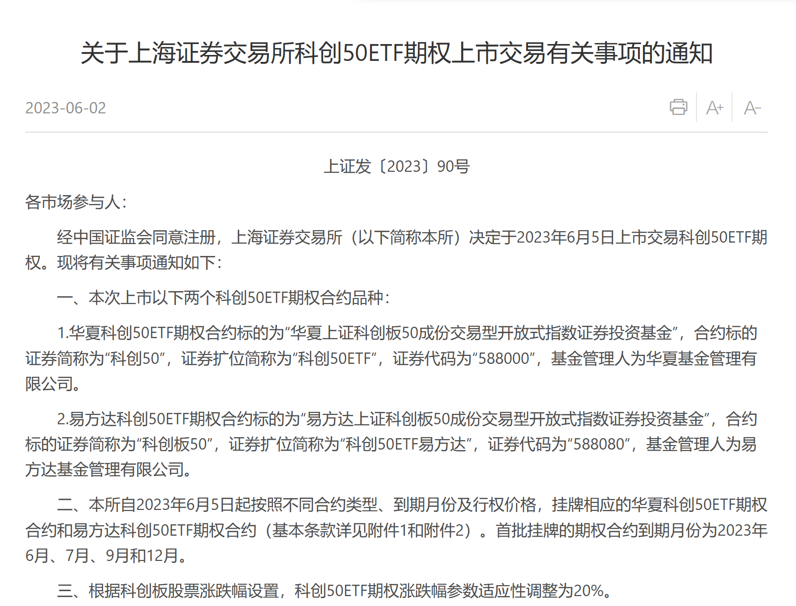 6月2日,上交所發(fā)布通知稱(chēng),經(jīng)中國(guó)證監(jiān)會(huì)同意注冊(cè),決定于6月5日上市交易科創(chuàng)50ETF期權(quán)。