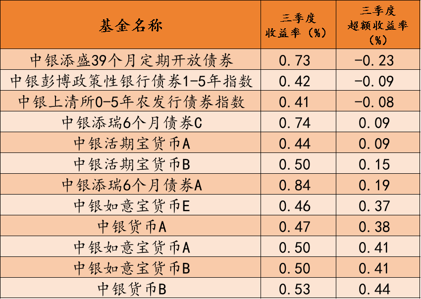 不過,也有中銀添盛39個月定期開放債券型證券投資基金、中銀榮享債券、中銀彭博政策性銀行債券1-5年指數(shù)證券投資基金、中銀上海清算所0-5年農(nóng)發(fā)行債券指數(shù)證券投資基金微幅跑輸同期業(yè)績比較基準(zhǔn),分別跑輸0.23個百分點(diǎn)、0.09個百分點(diǎn)和0.08個百分點(diǎn)。