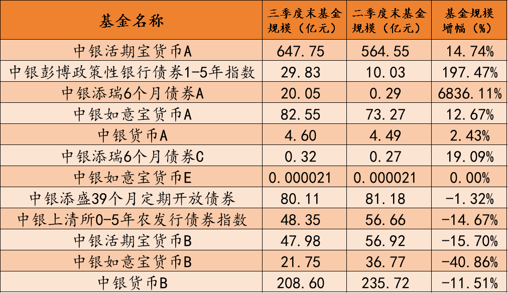 其中中銀活期寶貨幣市場基金A在三季度期間的基金利潤實(shí)現(xiàn)2.7億元,中銀貨幣市場證券投資基金B(yǎng)在三季度期間的基金利潤實(shí)現(xiàn)1.39億元。
