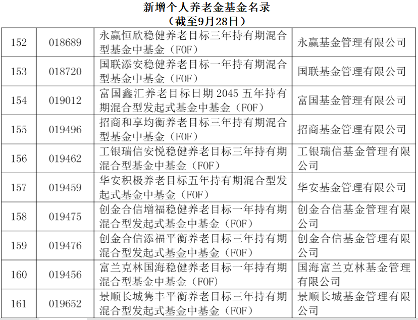 10月20日晚,中國證券投資基金業(yè)協(xié)會(以下簡稱“中基協(xié)”)發(fā)布的個人養(yǎng)老金基金名錄和個人養(yǎng)老金基金銷售機構(gòu)名錄顯示,截至今年9月28日,個人養(yǎng)老金基金數(shù)量達161只、個人養(yǎng)老金基金銷售機構(gòu)數(shù)量為48家,相比二季度分別新增10只、3家。