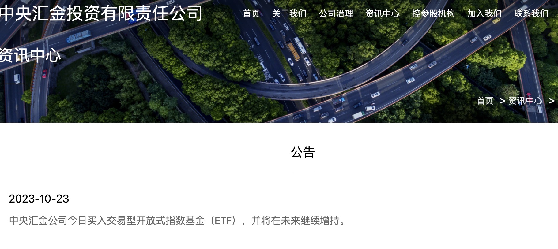 10月23日,中央?yún)R金投資有限責(zé)任公司公告稱,中央?yún)R金公司今日買入交易型開放式指數(shù)基金(ETF),并將在未來繼續(xù)增持。