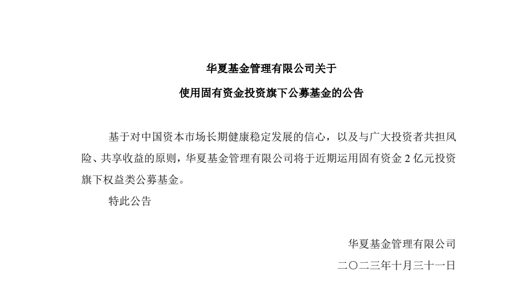 10月31日,華夏基金公告稱(chēng)基于對(duì)中國(guó)資本市場(chǎng)長(zhǎng)期健康穩(wěn)定發(fā)展的信心,以及與廣大投資者共擔(dān)風(fēng)險(xiǎn)、共享收益的原則,華夏基金管理有限公司將于近期運(yùn)用固有資金2億元投資旗下權(quán)益類(lèi)公募基金。