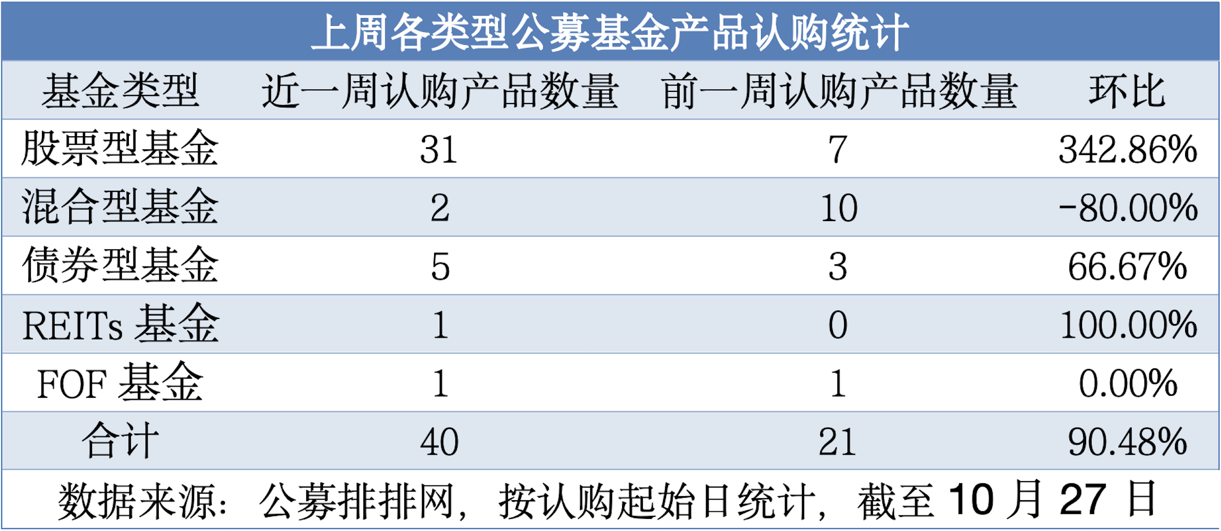 公募排排網(wǎng)數(shù)據(jù)顯示,截至10月27日,按基金認(rèn)購(gòu)起始日統(tǒng)計(jì),近一周共有40只基金開啟認(rèn)購(gòu),較前一周的21只相比,環(huán)比大幅增長(zhǎng)90.48%。