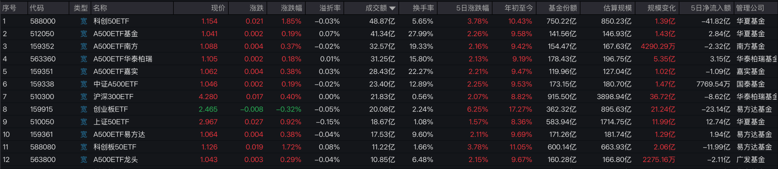寬基ETF方面,多只產(chǎn)品交投活躍,成交額迅速放大。截至今日午間收盤,科創(chuàng)50ETF(588000)成交額達(dá)48.87億元。此外,還有A500ETF基金(512050)、滬深300ETF(510300)等11只寬基ETF成交額均超10億元。