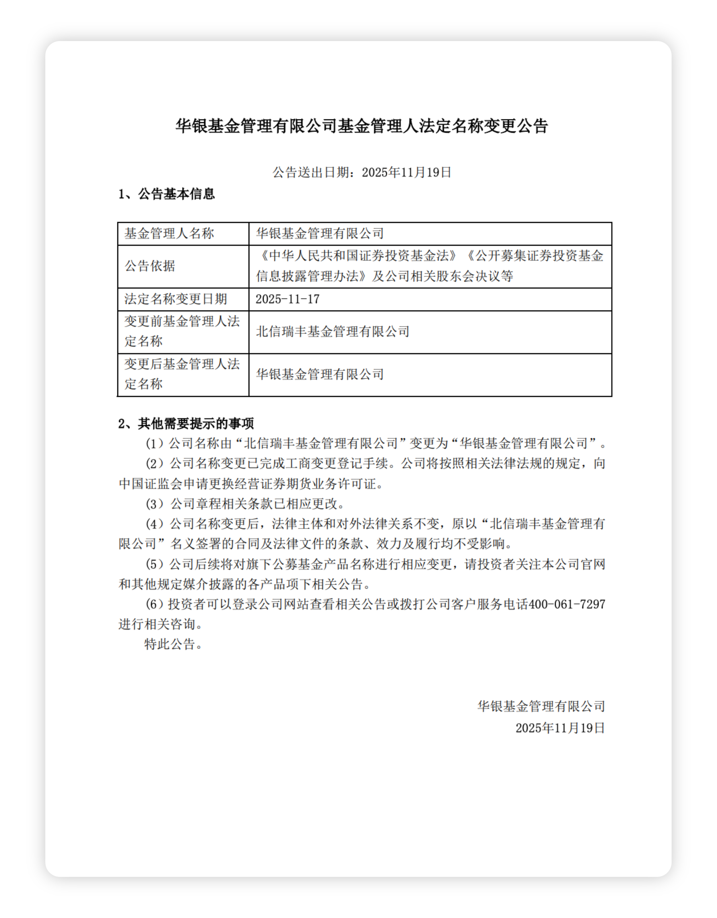 本報(bào)訊 (記者彭衍菘)11月19日,原北信瑞豐基金管理有限公司公告稱,公司名稱變更為“華銀基金管理有限公司”(以下簡稱“華銀基金”)。