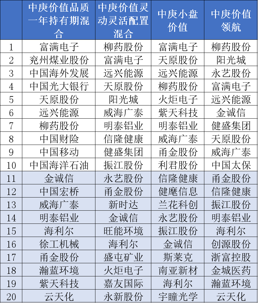以下為丘棟榮旗下四只基金前20名重倉股明細:
