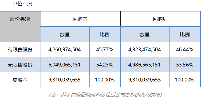 根據(jù)擬定的回購方案,蘇寧易購預計出資不超過10億元從二級市場回購股份,按照回購價格16元計算,約為6250萬股,占公司總股本約0.67%。若回購股份全部用于員工股權激勵計劃,則回購股份轉讓后公司有限售股份比例由45.77%增至46.44%。