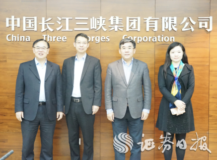 中國長江三峽集團公司黨組成員、總會計師楊亞(左一),集團公司黨組成員、副總經(jīng)理、中國長江電力股份公司總經(jīng)理張定明(右二)與證券日報記者董少鵬(左二)、新華社記者趙曉輝(右一)在采訪后合影。