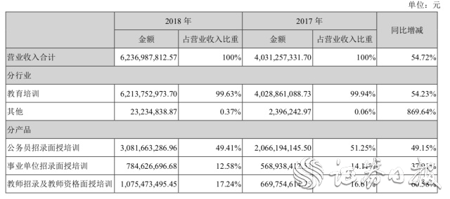 4月8日晚間,中公教育發(fā)布2018年年報。年報顯示,2018年公司營收62.37億元,同比增長54.72%;其中教育培訓(xùn)業(yè)務(wù)營收62.14億元,占當(dāng)年營收99.63%,營收同比增長54.23%;以產(chǎn)品劃分,其公務(wù)員招錄面授培訓(xùn)占比最高,營收30.82億元,占當(dāng)年營收49.41%,同比增長49.15%。