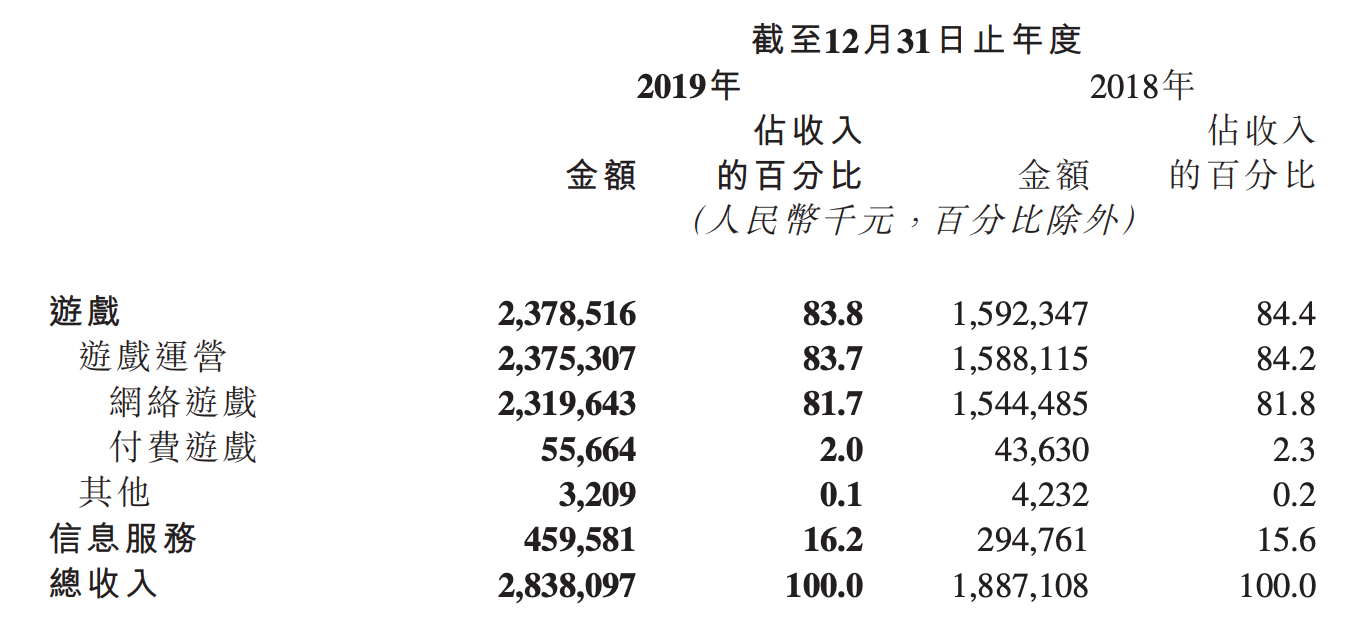 2019年,心動公司的游戲組合由38款網(wǎng)絡(luò)游戲及11款付費(fèi)游戲組成。其中,網(wǎng)絡(luò)游戲2019年收入23.2億元,占總收入比81.7%,同比增長50.2%。