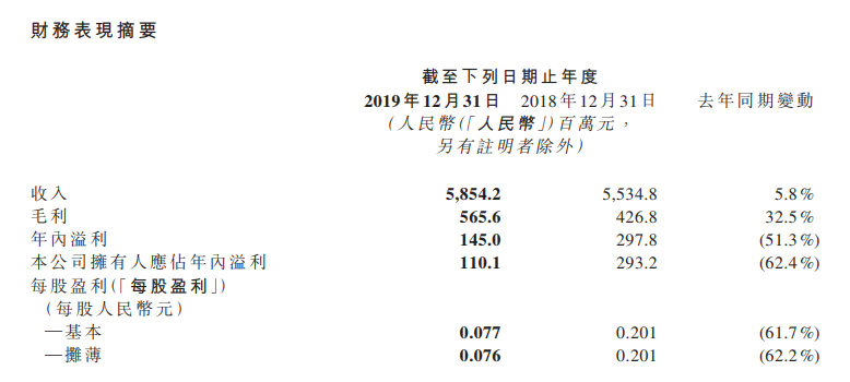 3月31日晚間,科通芯城(0400.HK)發(fā)布了2019年財報,全年收入58.54億元,比2018年微增5.8%,毛利5.65億元,比2018年增長32.5%,但歸屬于母公司股東凈利潤為1.1億元,相比2018年下降了62.4%。