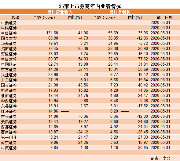 從年內(nèi)業(yè)績(jī)表現(xiàn)來(lái)看,前5個(gè)月,目前有數(shù)據(jù)可查的23家上市券商共計(jì)實(shí)現(xiàn)凈利潤(rùn)854億元,實(shí)現(xiàn)凈利潤(rùn)355億元。目前來(lái)看,中信證券業(yè)績(jī)大幅領(lǐng)先其他券商位居第一,實(shí)現(xiàn)營(yíng)收131.6億元,凈利潤(rùn)55.7億元,分別同比增長(zhǎng)41%、36%。